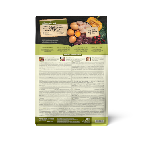 原材料 生鴨肉 (12%), 新鮮鶏肉 (11%), 新鮮卵 (8%), 乾燥鶏肉(7%), 乾燥七面鳥肉 (7%), 乾燥タラ (7%), 丸ごとピント豆,丸ごとエンドウ豆, 生七面鳥肉 (6%), 鶏脂肪 (5%), 丸ごと赤レンズ豆, 丸ごとヒヨコ豆, 丸ごと緑レンズ豆, 生ウズラ肉 (4%), 新鮮鶏内臓 (レバー, 心臓) (2%), フィッシュオイル (2%), 生七面鳥レバー (2%), レンズ豆繊維, 乾燥鴨肉(1%), 生鴨レバー (1%), 乾燥ケルプ, 新鮮丸ごとカボチャ,新鮮丸ごとバターナッツスクワッシュ, 新鮮丸ごとニンジン, 新鮮丸ごとリンゴ, 新鮮丸ごと洋梨, 新鮮丸ごとズッキーニ, 乾燥チコリールート, 新鮮ケール, 新鮮ホウレン草, 新鮮カブラ菜, 新鮮ビートの葉, 丸ごとクランベリー, 丸ごとブルーベリー, 丸ごとサスカトゥーンベリー,ターメリック, オオアザミ, ゴボウ, ラベンダー, マシュマロルート, ローズヒップ